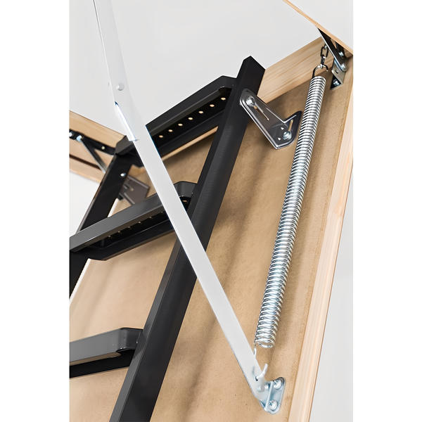 LME is a heavy-duty attic ladder that folds in three sections. The lid is insulated and a seal lines the perimeter of the frame. An elegant attic ladder with high-quality design and materials, the Fakro Insulated Steel Attic Ladder features powder-painted metal and 3-part construction with a locking mechanism for ease of use. Anti-slip steps and rails with rubber ends offer safety, making this 350 lb. duty-rated, ANSI-approved ladder a smart choice. Built to accommodate a variety of home designs, the ladder is adjustable in length, door distance and spring tension to suit the needs of your space.