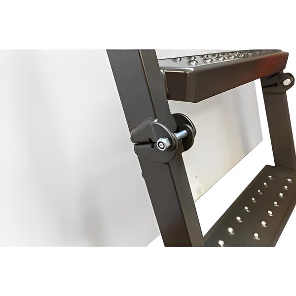 The LMP is a metal, 3-section folding attic ladder, designed for high spaces, up to 12 ft. It contains an unloading mechanism, hidden in the handrail that supports the folding and unfolding of the ladder. Its solid metal body is strong enough to hold 350 lbs.