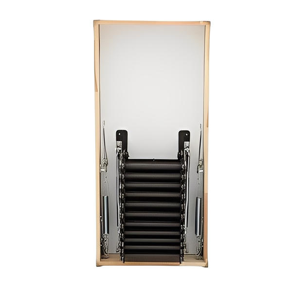 The LST is a scissor style, insulated and sealed attic ladder. It collapses as it folds away and expands as it opens. It is spring-loaded and includes a control rod, installation brackets, trim, and a white, finished lid. Get maximum security and versatility with this Fakro LST Scissor Attic Ladder. Safety features include S-shaped steps that serve as handrails when climbing and a powder-coated quality steel that is durable with a 350 lb. load capacity. The scissor system is well-balanced and the ladder allows you to adjust the length by adding or removing step segments. Each step adds 8 in. to a ceiling height and when you're done fold the ladder smoothly with little force.